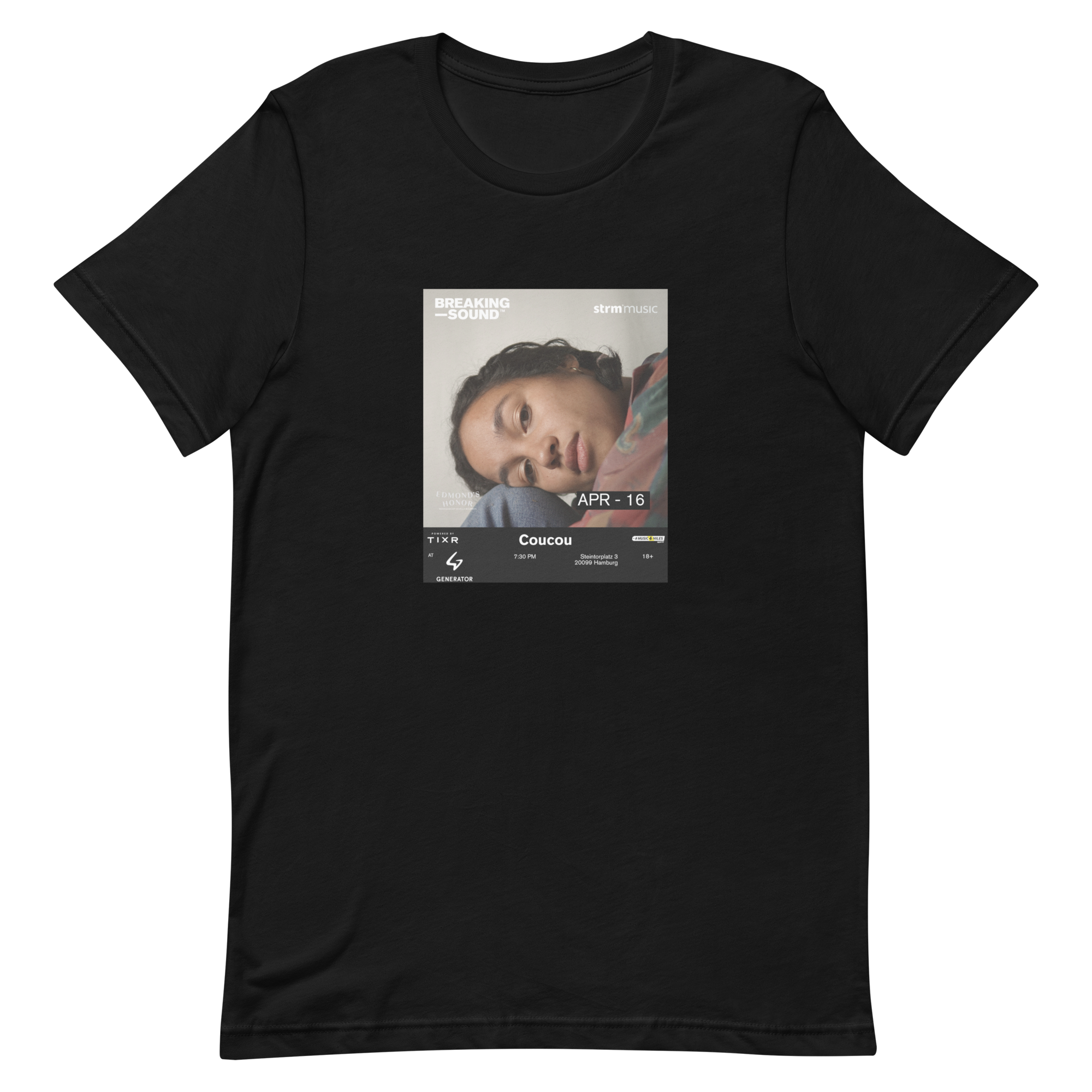 Limited Edition Artist Merch › Coucou x Breaking Sound Limited Edition Tee Image 1 of 1 Coucou x Breaking Sound Limited Edition Tee $35.00 Front print. 100% cotton. Size: XS S M L XL 2XL Purchase Added! Front print. 100% cotton.