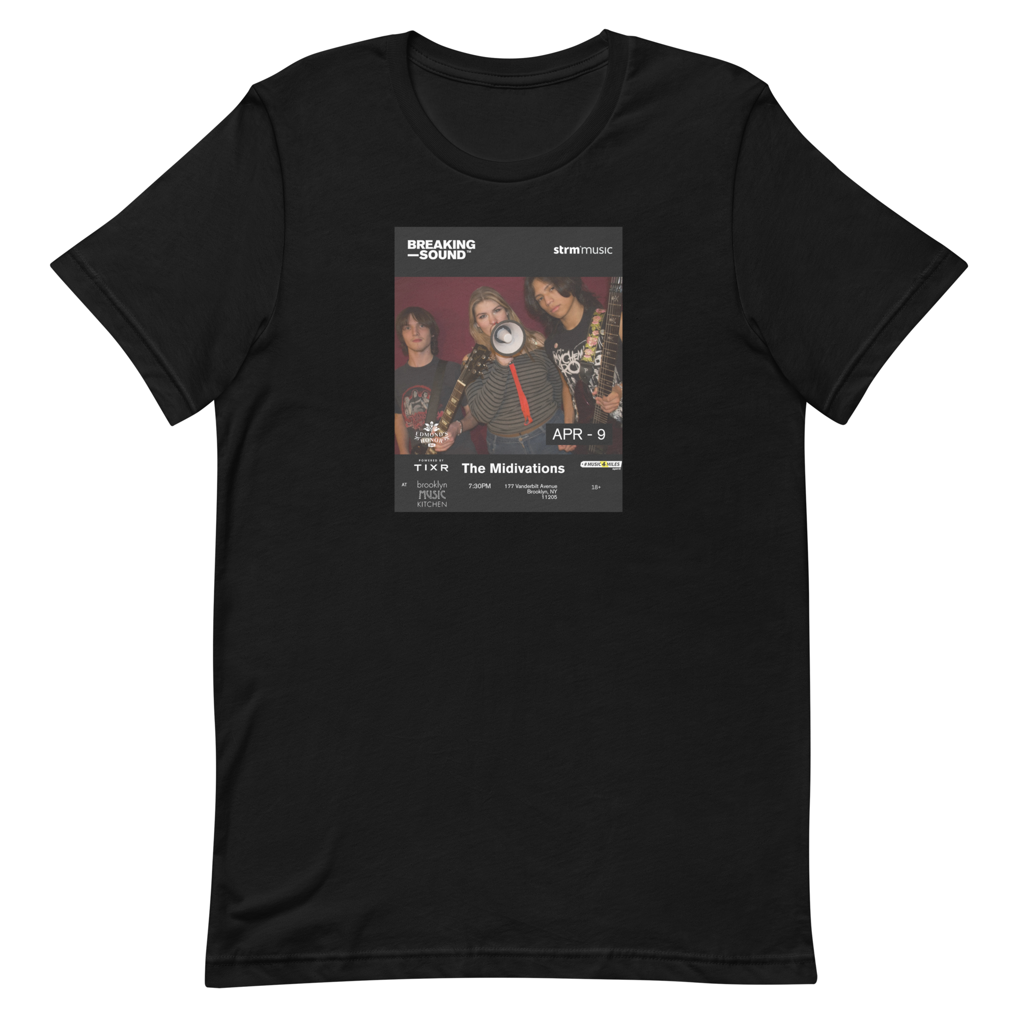 Limited Edition Artist Merch › THE MIDIVATIONS x Breaking Sound Limited Edition Tee Image 1 of 6 Image 2 of 6 Image 3 of 6 Image 4 of 6 Image 5 of 6 Image 6 of 6 THE MIDIVATIONS x Breaking Sound Limited Edition Tee $35.00 Front print. 100% cotton. Size: XS S M L XL 2XL Purchase Added! Front print. 100% cotton.
