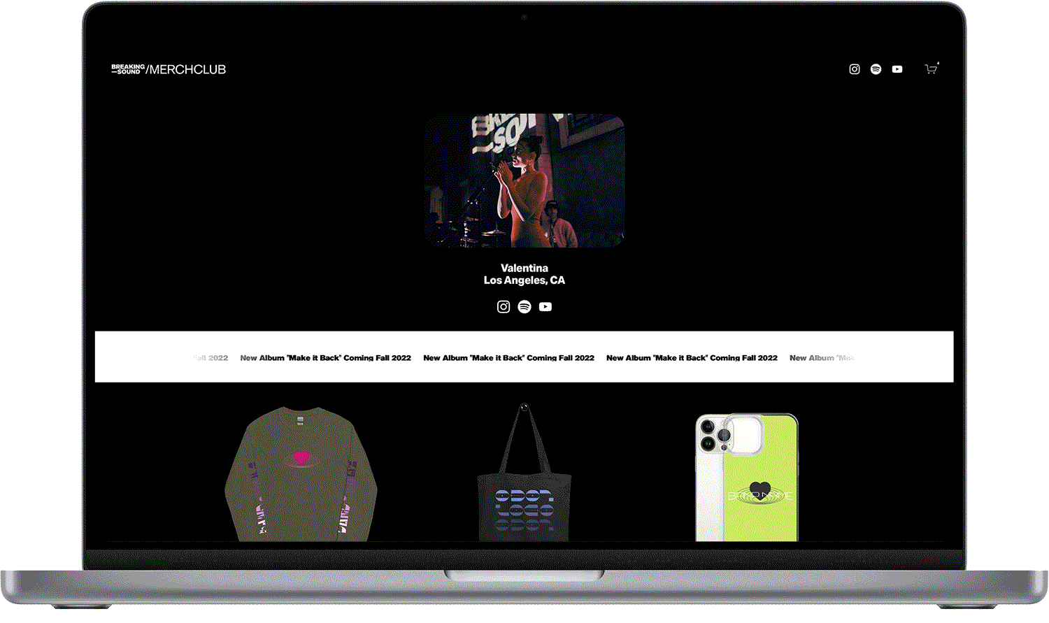 The way Merchclub works for artists is simple - we’ll work with you on a collection of 6 items: Hoodie, Tee, Sweater, Tote Bag, Hat, and iPhone Case